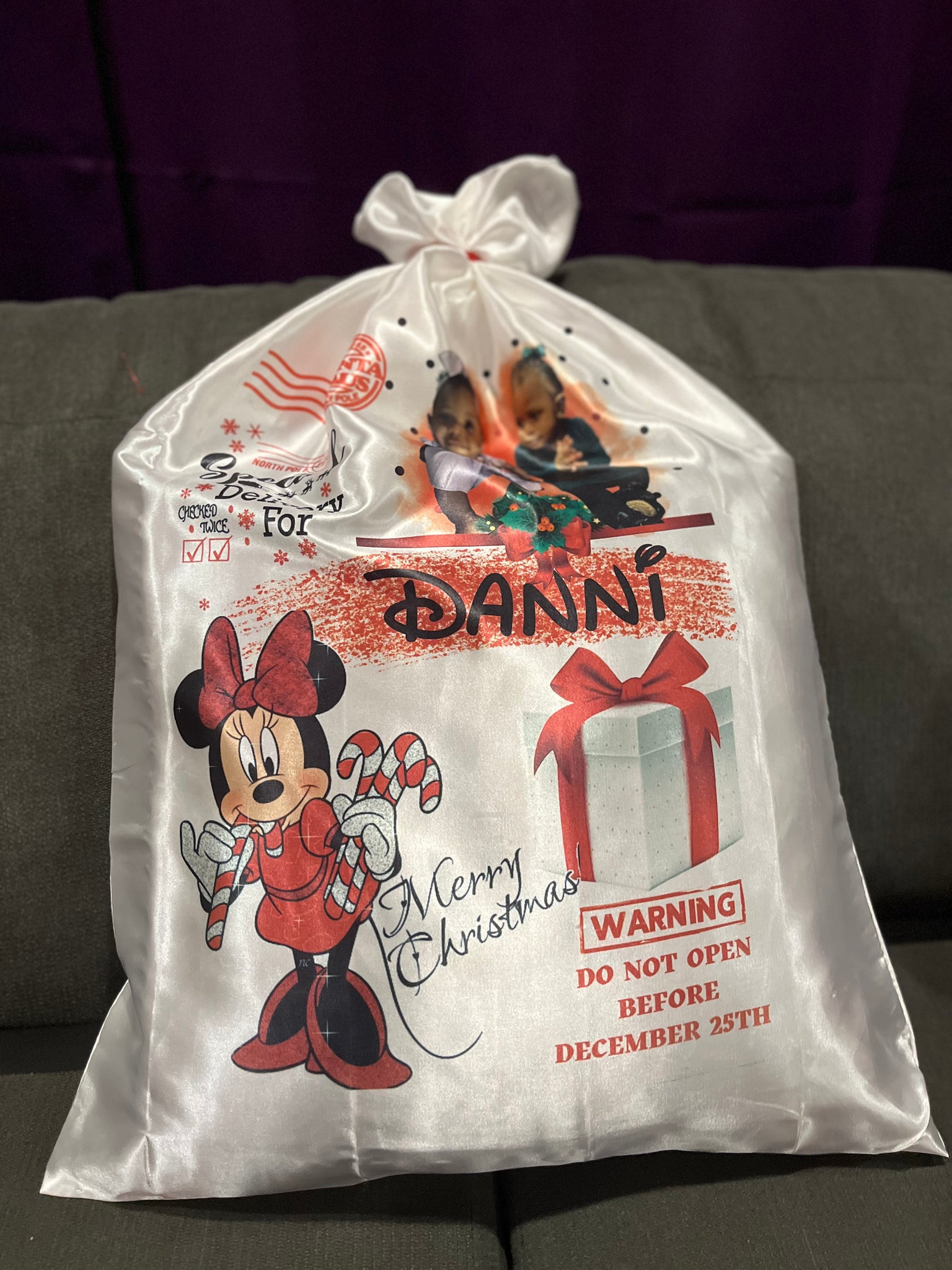 20X30" Silk Santa Sack - Multiple designs to choose from. Email us your concept and how many pictures you want added. You can add 1-2 pictures total. Email to ro@simplyrocreations.shop